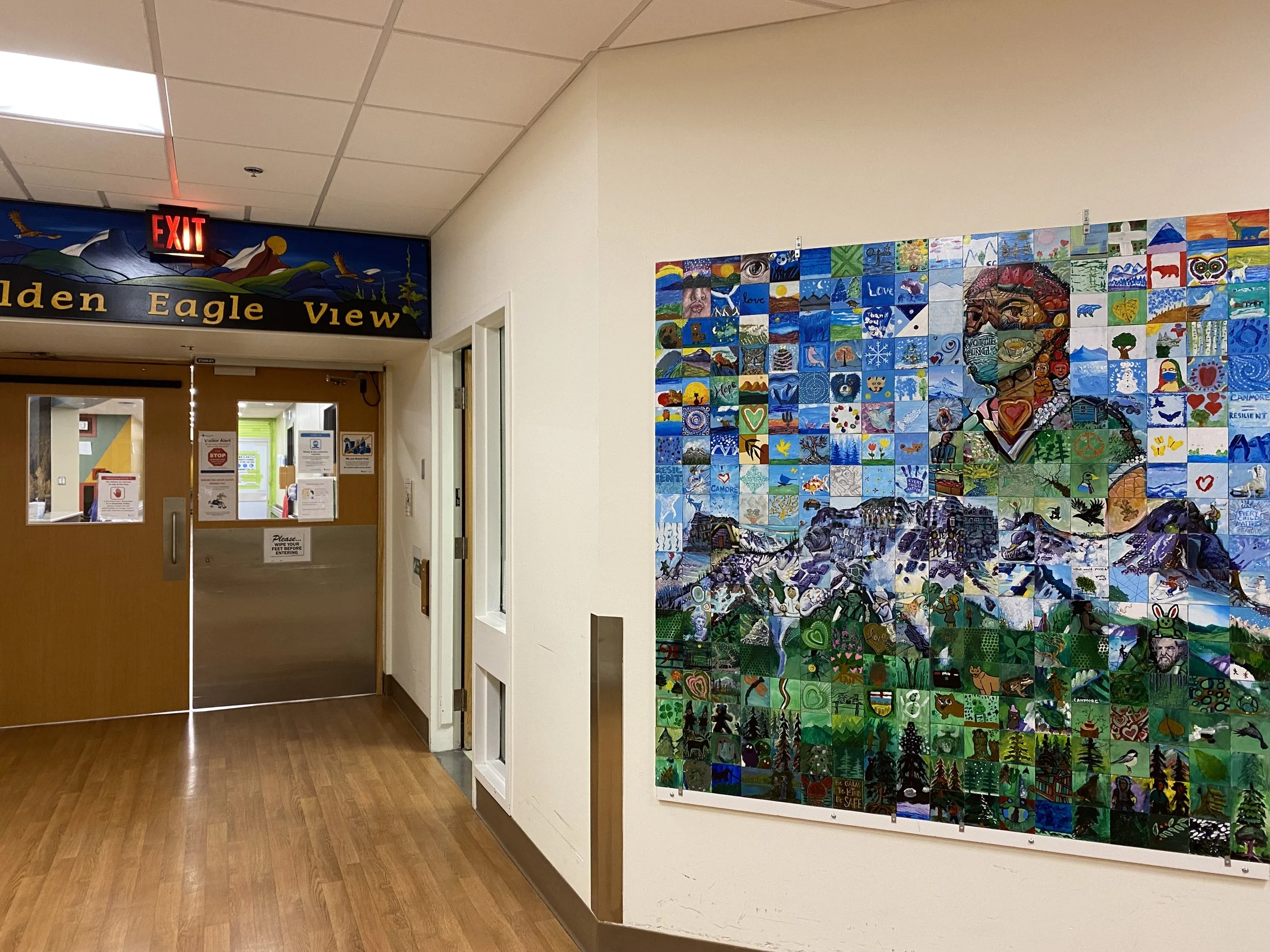 After I completed a basic sketch of the mural, we sent this off to Mural Mosaic out of Edmonton, AB. They then rendered a copy that included our numbered tiles and a colour plan. After prepping our tiles, Mural Mosaic sent them our way! Back at artsPlace we brought community together in-person (socially distancing of course!), or sent tiles to community members homes, to be painted in the blues, greys and greens that make up our valley home that protected us, and gave us a sense of calm during this turbulent time.